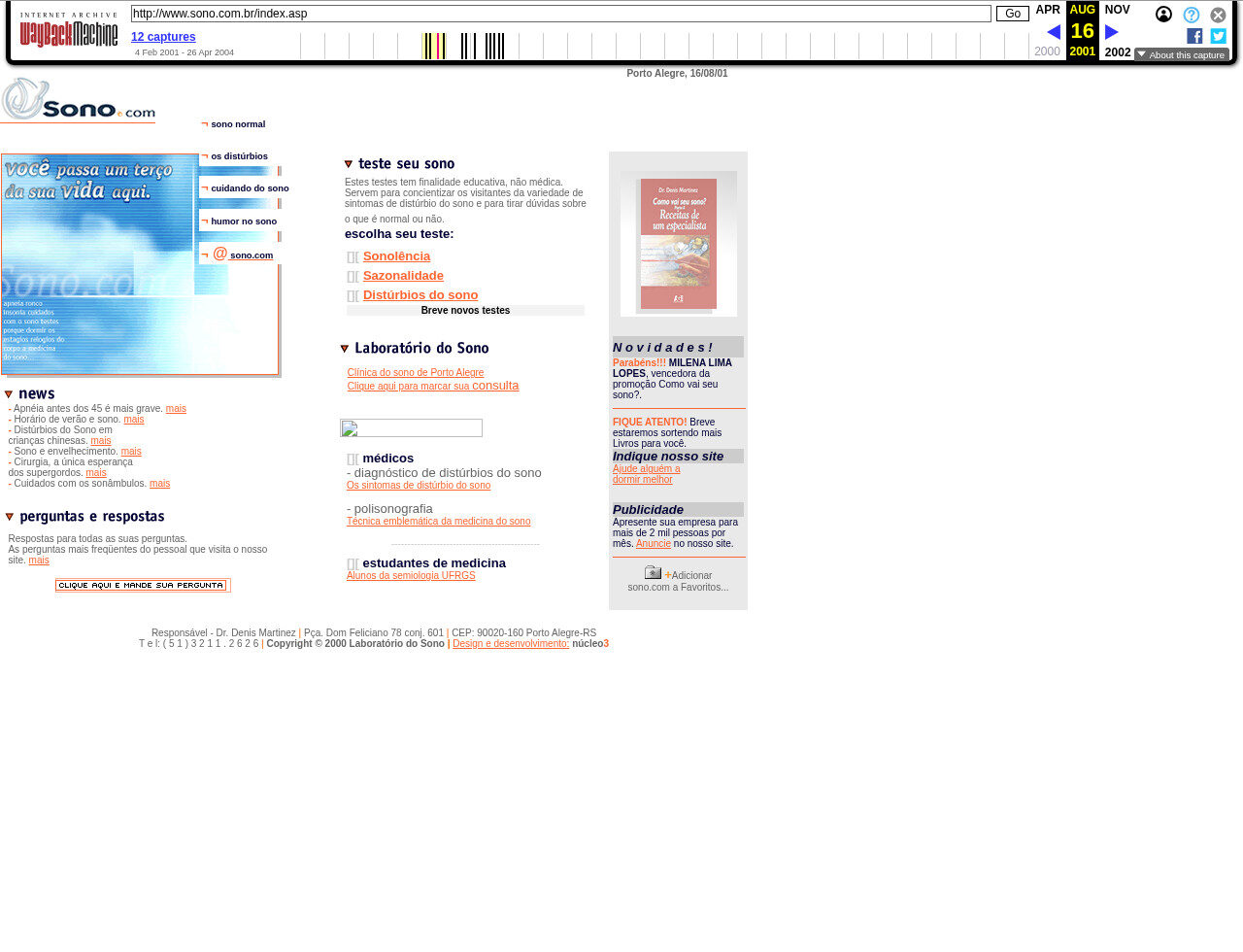 Este fragmento do site Sono.com.br nos mostra como eram os portais informativos do início dos anos 2000, com um foco grande em conteúdo educativo e organização em colunas. O design usa fundo branco e textos em azul e laranja, o que tenta passar uma ideia de tranquilidade e saúde. O layout é bem simples, com menus nas laterais e links em destaque, sem imagens grandes ou navegação moderna. A comunicação mistura temas científicos com toques de leveza, como na seção de humor e nos testes de sono. Há um GIF promocional vendendo um livro, o que era comum na época como forma de chamar atenção sem pesar no carregamento da página. A parte técnica também chama atenção: o site mostra um aviso do Ruffle, o que indica que usava Flash, uma tecnologia que hoje não é mais suportada. Isso mostra que alguns recursos interativos não foram preservados. Mesmo assim, grande parte do conteúdo ainda aparece, com textos e links funcionais.