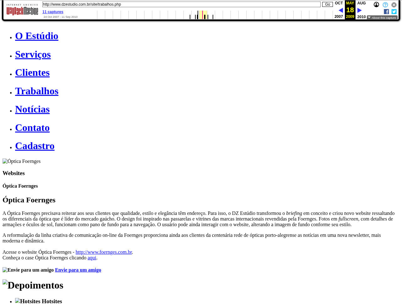 Este fragmento da DZ Estúdio nos mostra um site típico do final dos anos 2000, marcado por um visual simples e técnico. O design da página é bem básico, com fundo branco, texto preto e links em azul, seguindo um estilo funcional que priorizava leveza e rapidez no carregamento. A organização do conteúdo é feita por meio de listas verticais com seções como “Serviços”, “Clientes” e “Trabalhos”, mostrando um foco claro na estrutura e na navegação direta. A linguagem usada é formal, mas direta, voltada para descrever projetos e mostrar os clientes atendidos, o que reforça o perfil corporativo do site. Já na preservação, nota-se que muitas imagens não carregam corretamente, aparecendo como ícones quebrados, o que dificulta entender o visual original da página. Apesar disso, é possível perceber o esforço da empresa em seguir padrões técnicos da época, como mostra o selo do W3C no rodapé.