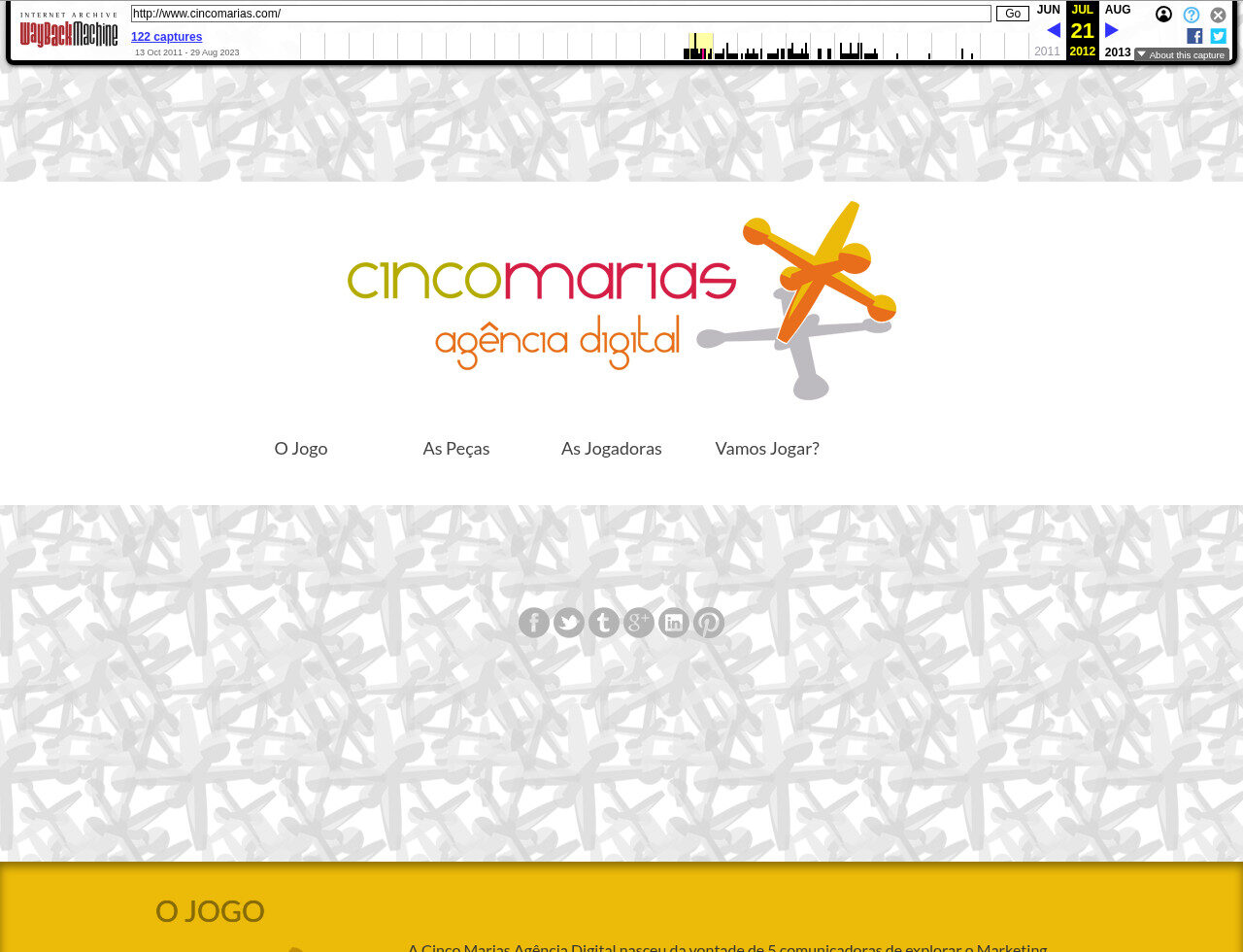 Este fragmento da agência Cinco Marias nos mostra um site com forte identidade visual e linguagem criativa, uma das caracteristícas dos anos 2010, quando agências digitais buscavam se diferenciar com propostas mais autorais. A apresentação da equipe como peças de um jogo e o uso do nome “Cinco Marias” remetem diretamente à uma proposta gamificada, criando uma metáfora que aproxima o visitante da marca. O design usa cores fortes, fundo com padrão repetitivo e seções nomeadas como “O Jogo” e “As Jogadoras”. Cada integrante é apresentada com uma personalidade própria, como “estrategista” ou “observadora”, o que permite que o público se identifique com as jogadoras de forma mais pessoal. Essa estratégia cria empatia e engajamento, como se o visitante pudesse “escolher sua jogadora favorita” e entender o funcionamento da equipe de forma leve. A linguagem próxima, somada às fotos expressivas, reforça essa sensação de proximidade. Por outro lado, alguns links levam a erros e há partes da navegação que não funcionam mais, revelando problemas na preservação da página.