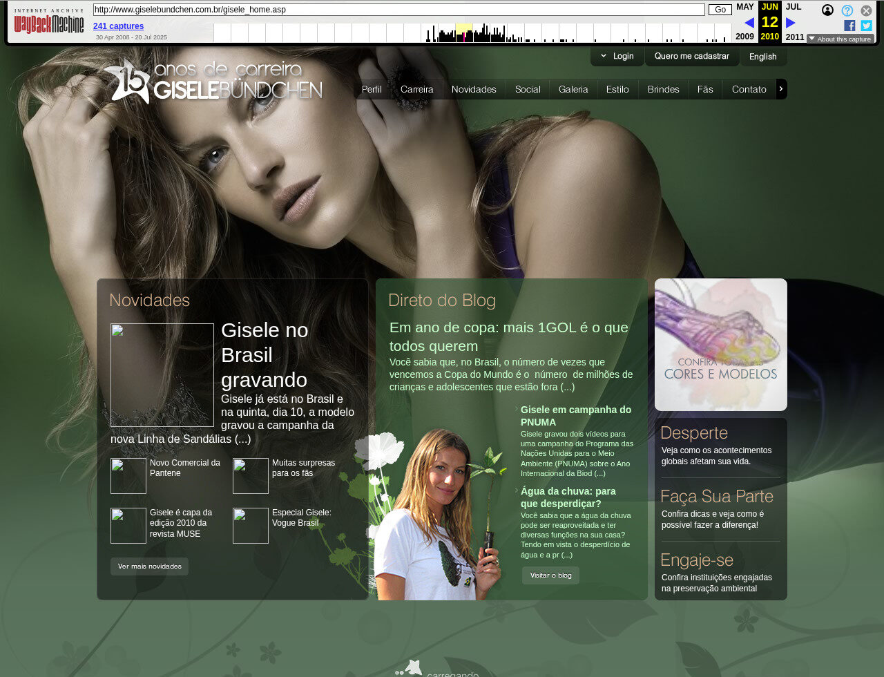 Este fragmento do site da Gisele Bündchen nos mostra como em 2010 as celebridades usavam páginas cheias de fotos em alta, fundos florais e menus compactos para parecer revista e portal ao mesmo tempo, reforçando a imagem de estrela da moda ligada ao discurso verde. Os blocos de notícias, blog pessoal, enquete e mural de recados criam uma conversa direta com fãs, a linguagem é leve e promocional e a presença de selos sobre biodiversidade indica o esforço de conectar consumo de produtos com causas ambientais, retrato de um momento em que o público buscava proximidade mas ainda navegava majoritariamente no desktop. Na preservação parte dos vídeos em Flash caiu e alguns carrosséis viram avisos de erro, porém há GIFs simples que continuam rodando e a estrutura HTML mantém texto e links legíveis.